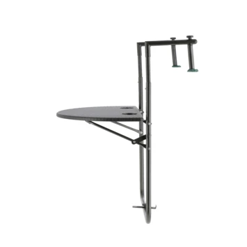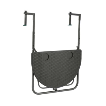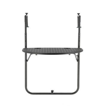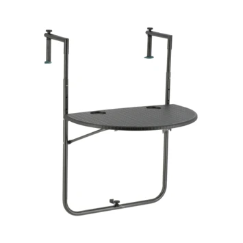 De halfronde balkontafel is ruimtebesparend. U kunt de tafel ophangen aan de balustrade van uw balkon, waardoor er geen tafelpoten op de grond in de weg staan. Het strakke tafelblad is groot genoeg om aan te eten. Daarnaast kunt u twee drankjes in de bekerhouders kwijt, waardoor deze niet schuiven. Bent u uitgegeten? Dan klapt de tafel gemakkelijk weer op door het haakje onder het blad los te maken. Het frame is afgewerkt met een hoogwaardige lak wat het weersbestendig maakt. De balkontafel heeft een gevlochten kunststof tafelblad is. De balkontafel is op te hangen met de haken aan de bovenzijde, met de wieltjes op de haken kunt u de tafel stevig aandraaien.